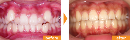 不正咬合(出っ歯、受け口、乱杭歯、八重歯など・・・)を装置を用い、歯を動かすことによって治します。きれいな歯並びで笑顔を、正しい噛みあわせでよい食生活を、また虫歯・歯周病予防にもつながります。